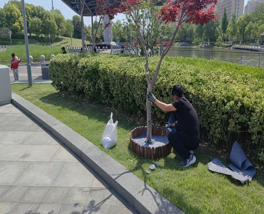 在施工現(xiàn)場,養(yǎng)護(hù)人員將回收木樁截取統(tǒng)一長度,精心配色組合使用環(huán)保彩漆涂刷橫截面,將原本單調(diào)的樹穴打造為充滿藝術(shù)氣息的“五彩景框”,顯著提升了公園整體景觀效果。