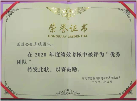 近日,園區(qū)公舍客服條線在2020年建發(fā)公司績效考核中,榮獲“建發(fā)公司優(yōu)秀團(tuán)隊(duì)”稱號(hào)。
