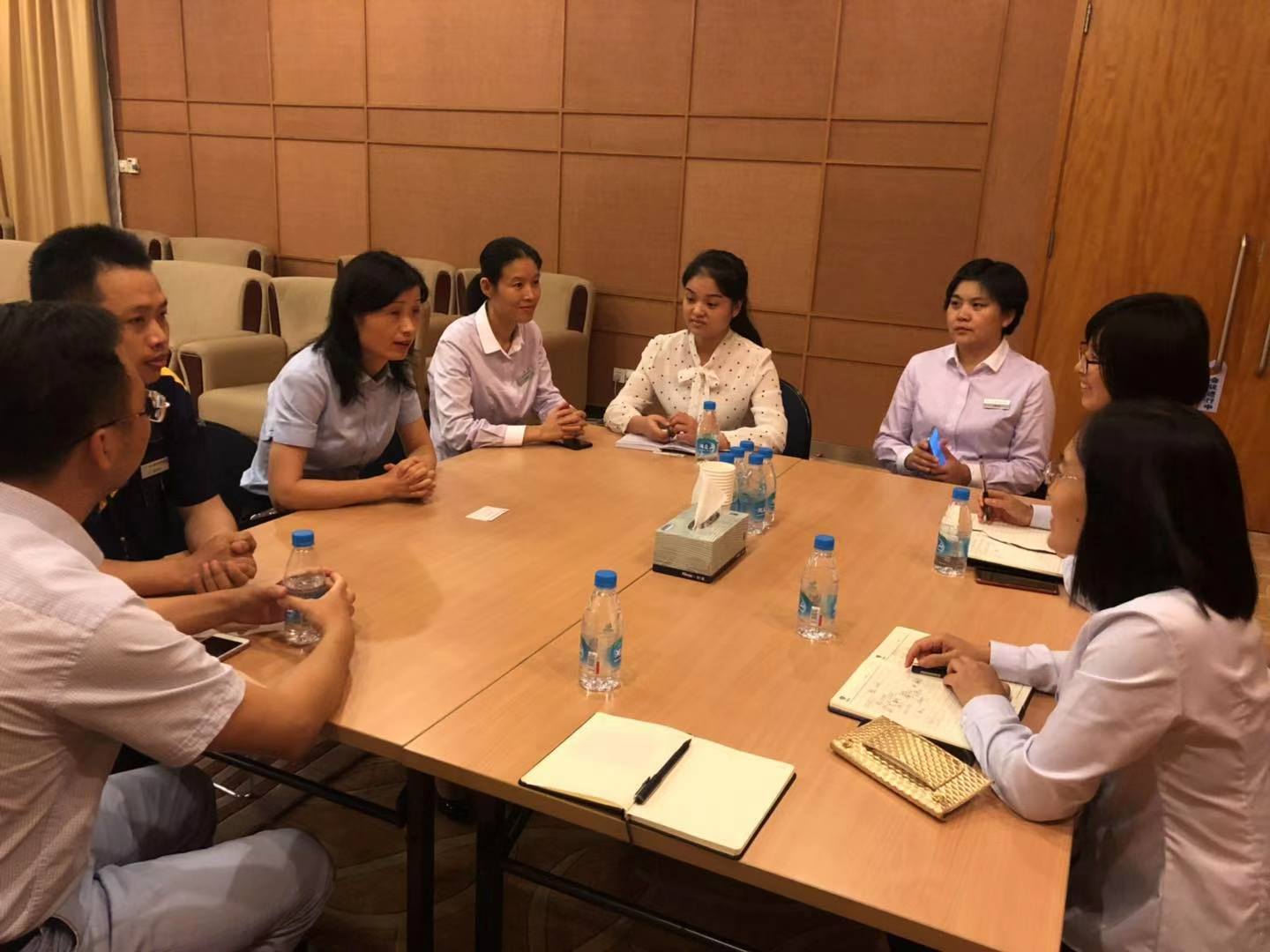 一行人兵分兩路,客服環(huán)境組跟隨蘇州工業(yè)園區(qū)環(huán)境部負責人學習會務服務的會前準備工作、會后清潔工作,重點學習會務實操服務,工程人員跟隨工程部學習會議廳設備配置和保養(yǎng)。